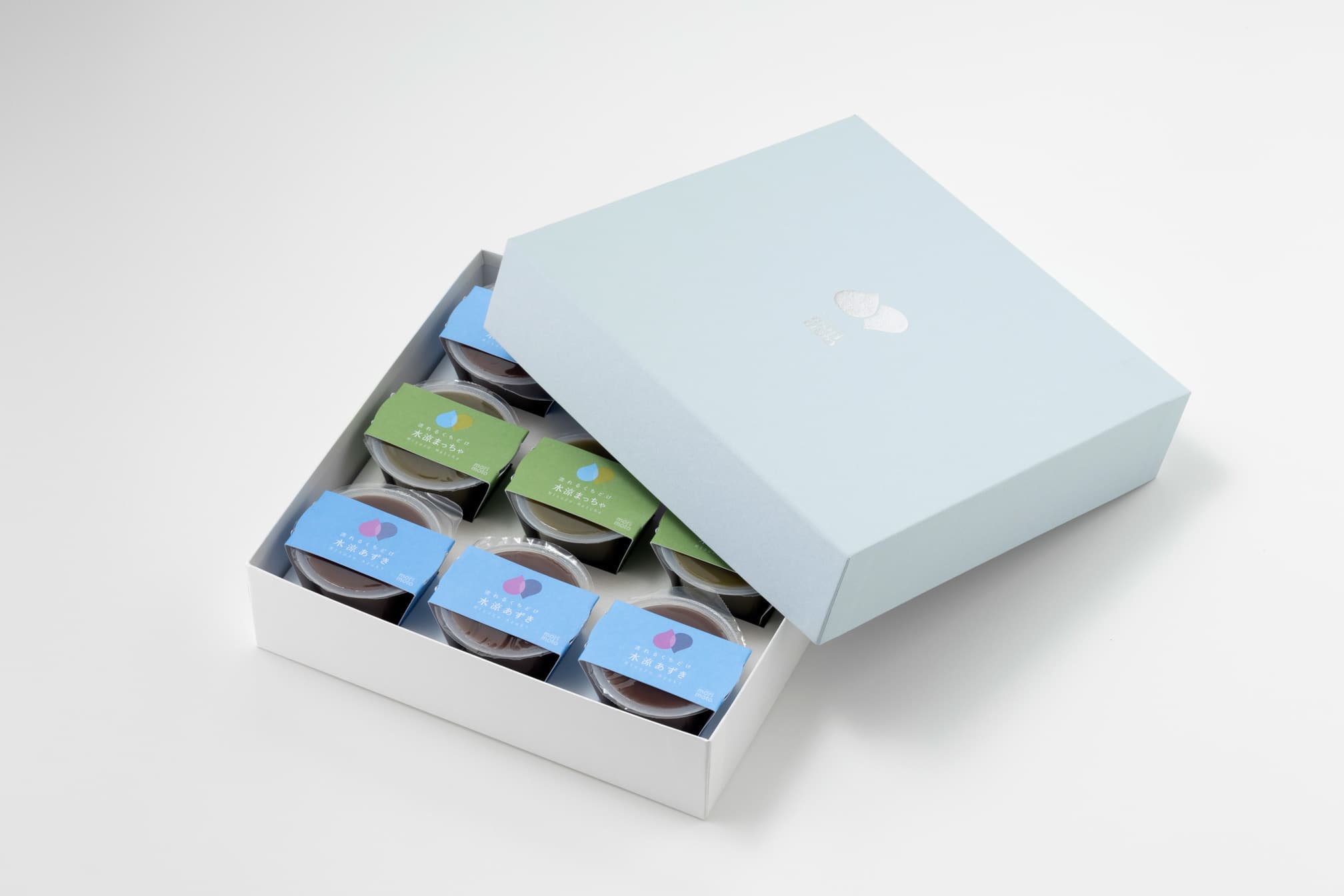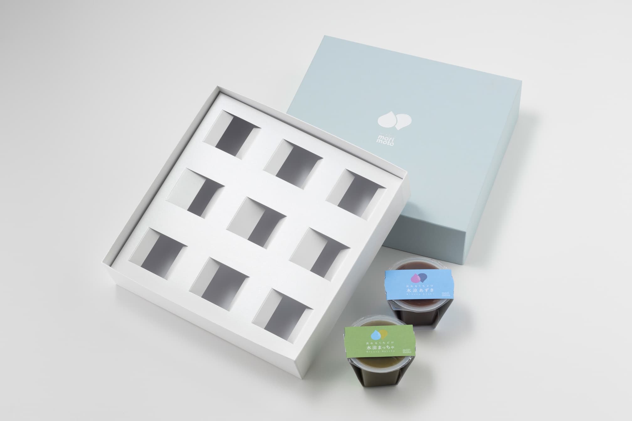 水ようかんを入れる貼函です。水ようかんで使用しているおいしい水をイメージした貼紙に、シルバーの箔押しをしております。また容器を包んでいる1個入のスリーブも弊社で製作しております。