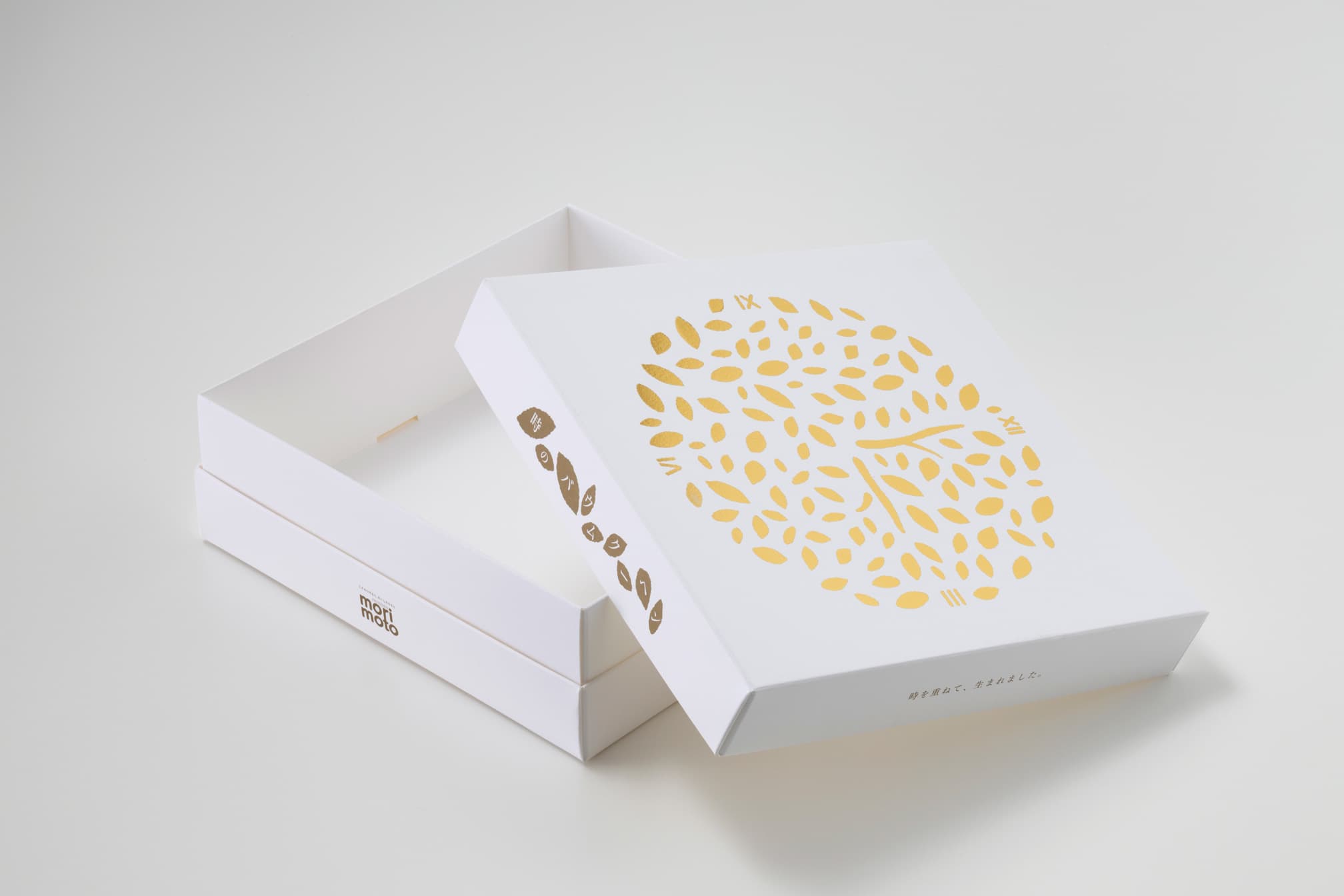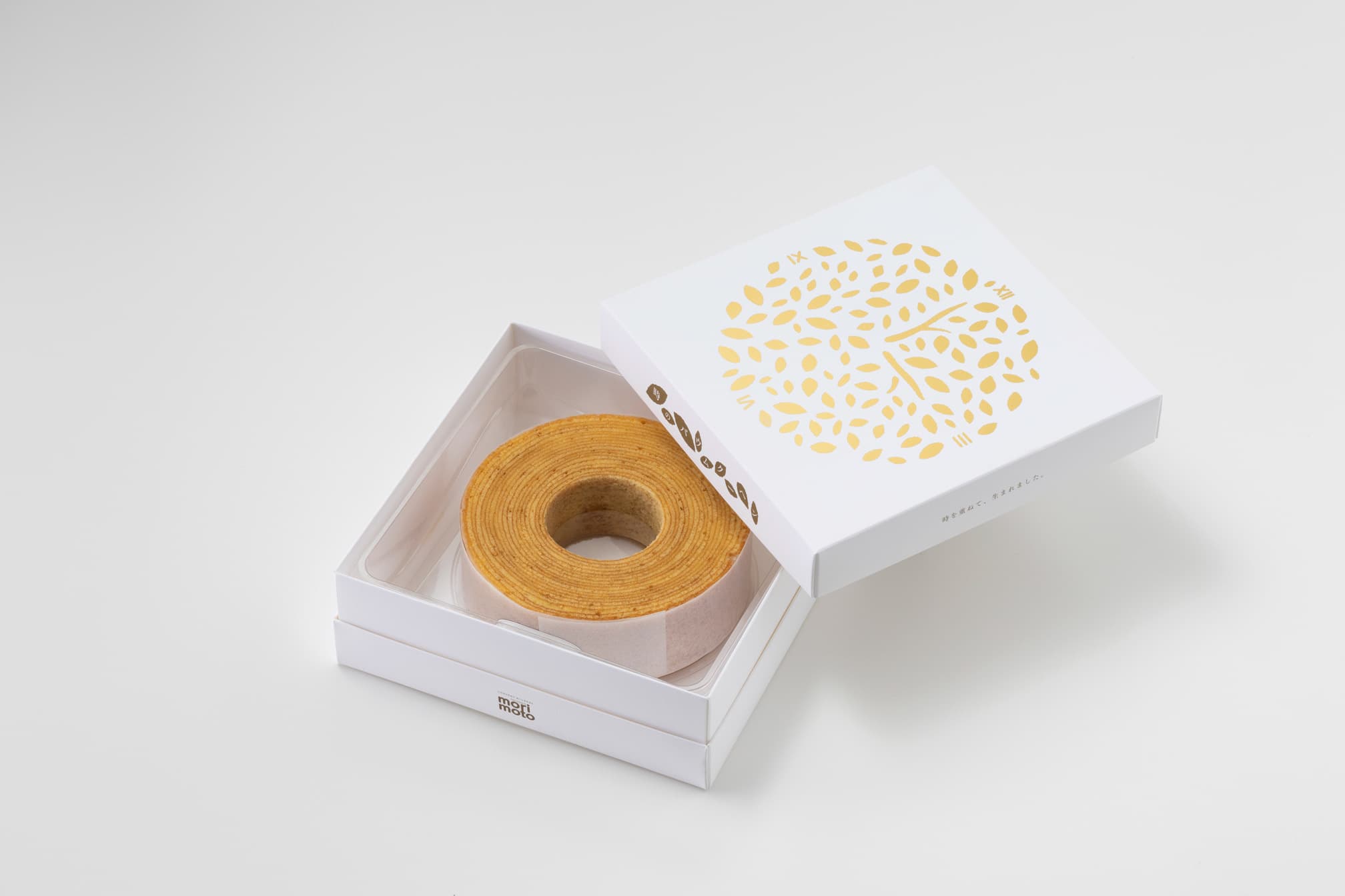 形式:印籠式組立箱品名:時のバウムクーヘンユーザー:株式会社もりもと様 バウムクーヘンを入れる箱です。白い紙に木の年輪をモチーフにしたデザインを、金箔押ししております。形状は組み立て式で、平の状態になります。