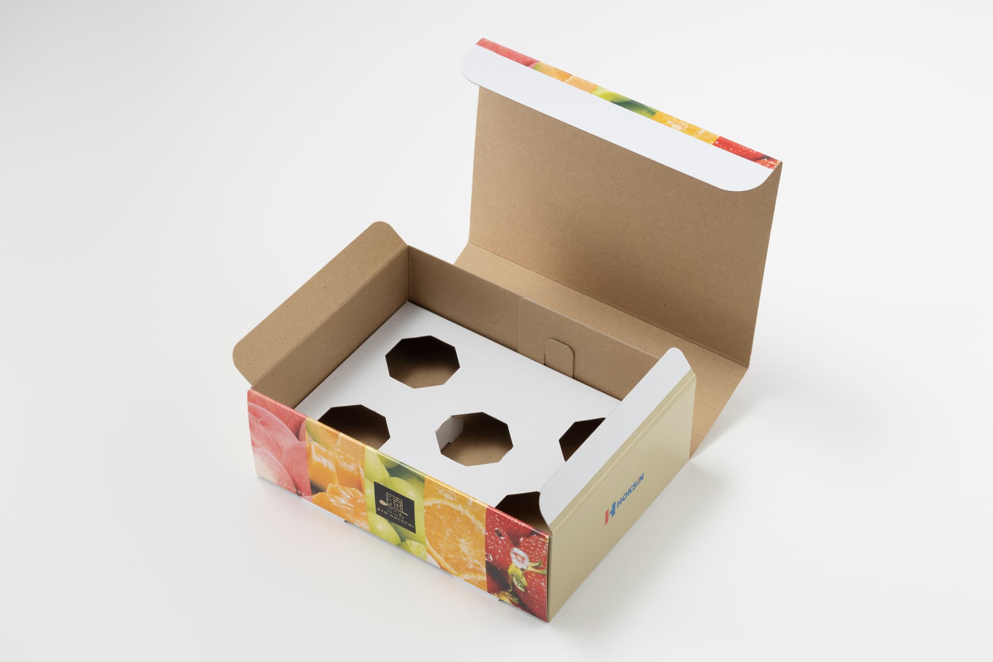 涼ごこちゼリーが5個入るN式のケースです。印刷したボール紙とダンボールを合紙し、強度を出しております。また形状は組み立て式で、平の状態になります。