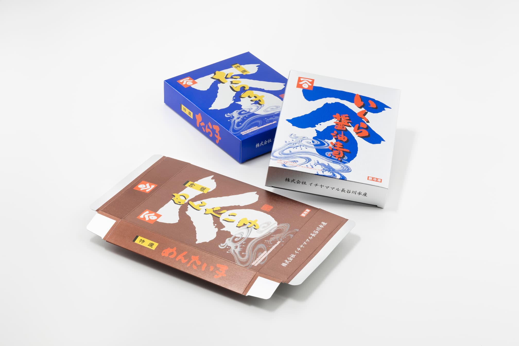 魚卵各種500g用のパッケージです。高級感・インパクトを持たせるために、シルバーの紙に印刷しております。形式はキャラメル式で1カ所胴貼りされており、折りたたむことができます。