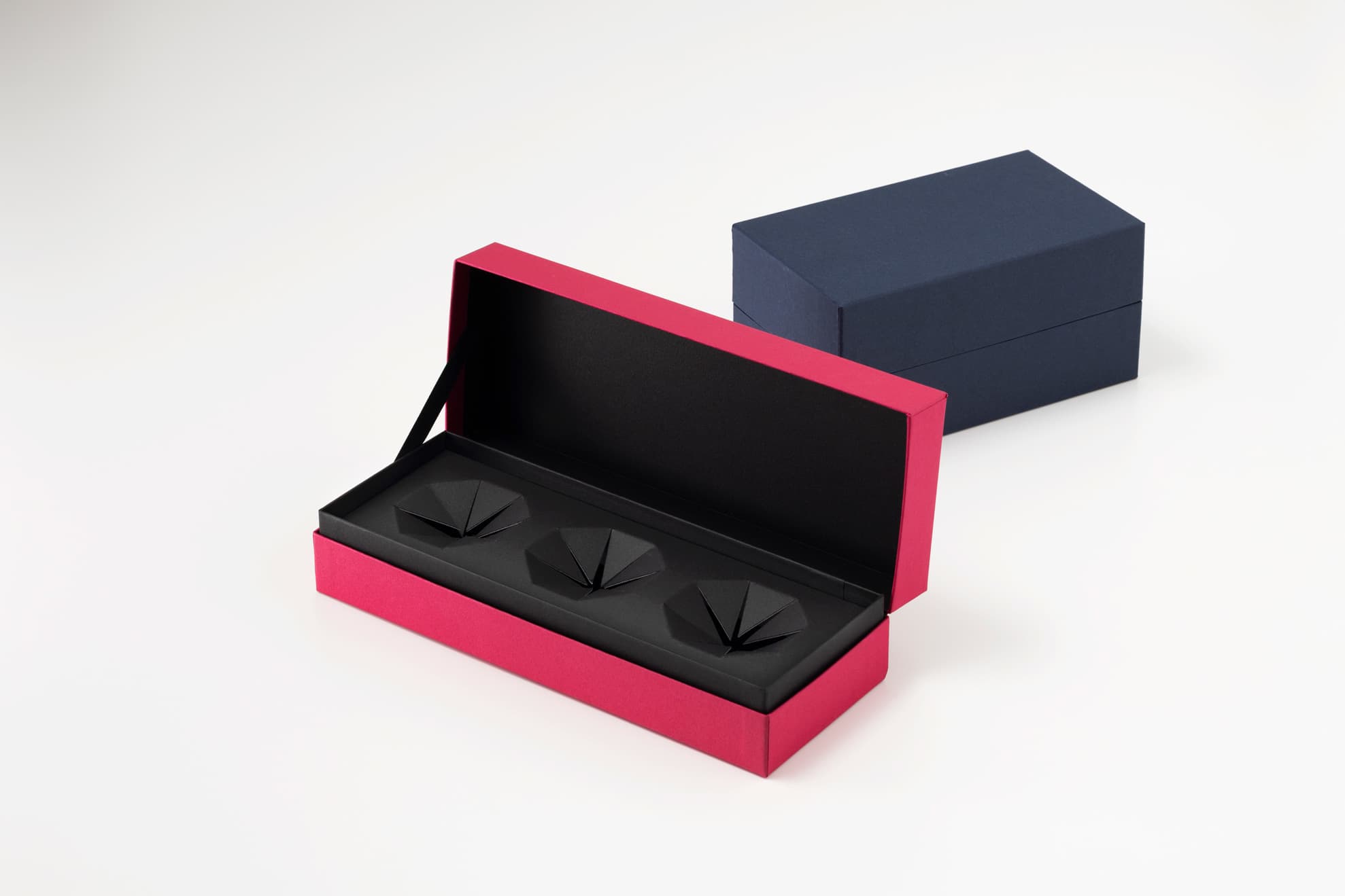 印籠式リボン付貼函です。身と蓋の外側と内側の貼紙を変え、中枠にはサテン生地を貼り付け高級感を持たせております。